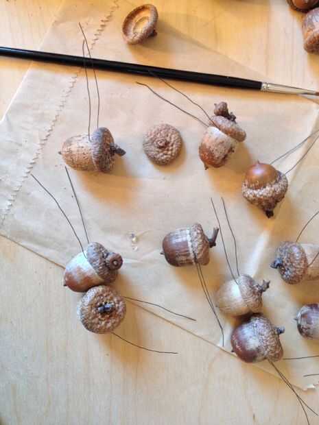 2. Separe las tapas de las bellotas. Añadir algún pegamento a la tapa de la bellota. Y el centro del alambre en la cola.