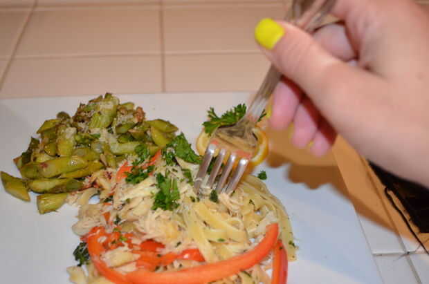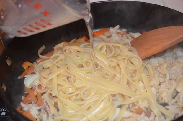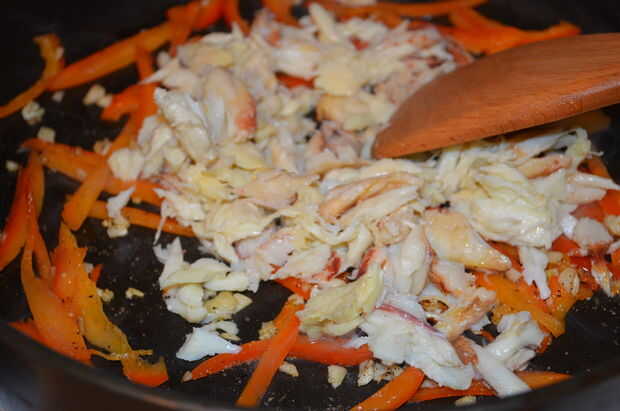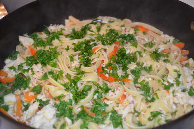 Luego, Caliente la sartén y añadir el aceite de oliva. Agregue la carne de cangrejo, ajo y pimiento rojo, jugo de limón y Cubadisco por 3 minutos. Finalmente agregamos el fetuccini con ml 1/4 de agua tenias aparte, añadir el perejil y Cubadisco por 2 minutos.