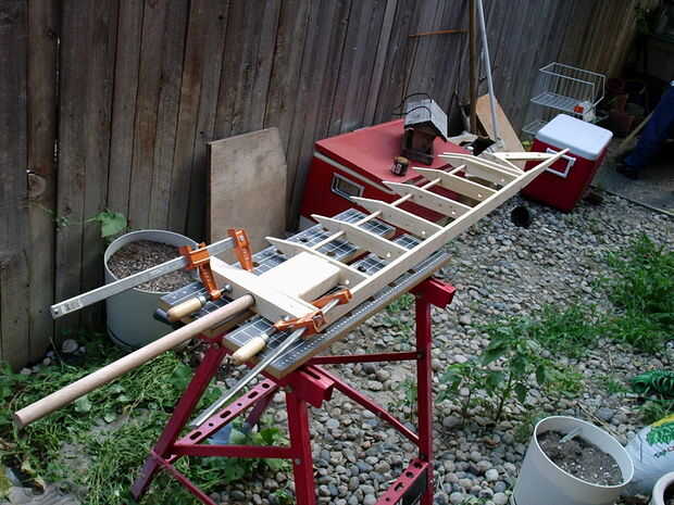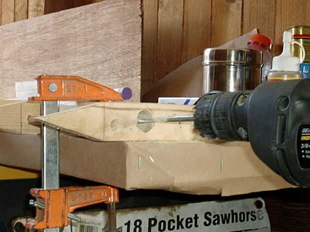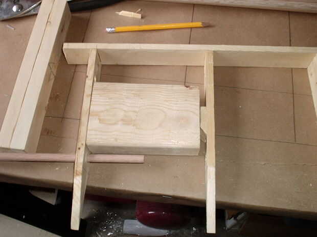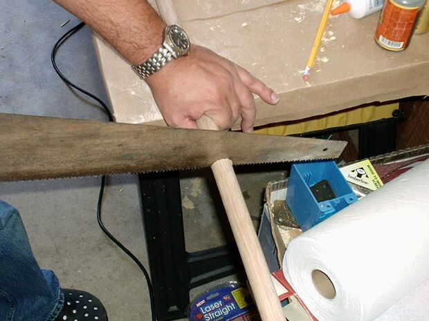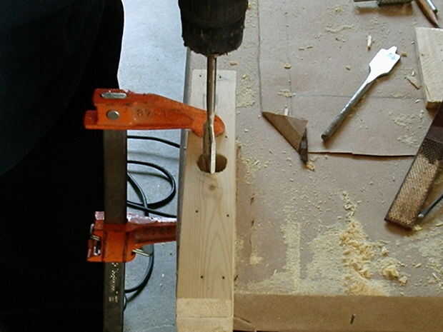Ahora que tienes todas las que hecho y luego se pueden lijarles para que sean agradables. Ahora toma la parte posterior y los soportes, está a punto de ponerlos juntos. Toma el pegamento del gorila y siga las instrucciones en el envase y los soportes en los intervalos en la parte posterior del pegamento, tome el clavo pistola (probablemente conectado a un compresor de aire) Asegúrese de que la presión no es demasiado alta, ya que sólo pasará por la madera. Sería una buena idea para probarlo con un trozo de la misma madera. Una vez usted hacerlo bien entonces usted debe ponerlos juntos. Es más que suficiente para un día y necesita dejar que este seco durante al menos 4 horas, pero debe dejarla sentarse 24 completo. Si desea hacer más trabajo o ha regresado después de un día usted está listo para la guardia de la mano y el mango. Tomar algunos trozos de madera (si tienes suerte como yo deberían sólo abeja sentada cerca donde hacen todo tu trabajo y no tienes que comprar). Marque el centro; Esto es donde va a taladrar el agujero. Ahora uso un poco que es un poco más grande y luego la espiga gran que utilizas como un mango. Perfore a través de ambos