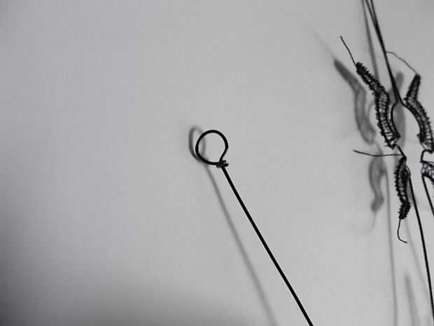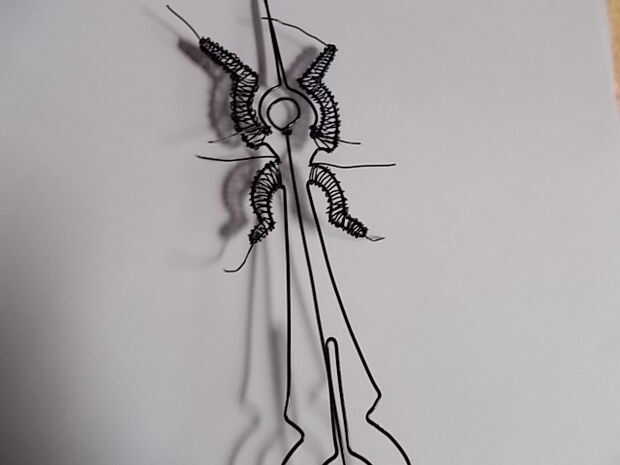 Con el extremo libre del alambre, hacer un círculo y enrolle el cable sobrante alrededor del alambre que esté conectado a la bobina. Poner esta forma de varita de la burbuja en su inacabado Masamune y ver cuánto hacia abajo vas a tener que cortar (ver fotos). Después de cortar el tubo, hacer un gancho en el extremo sin un círculo. Utilice el alambre delgado al gancho del gancho central de Masamune (otra vez, ver las fotos porque esto es difícil de explicar).