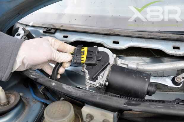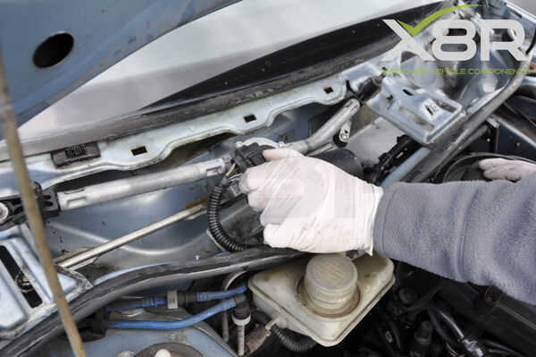 Desenchufe el conector eléctrico para el motor del limpiaparabrisas; levantar la pestaña de la clavija y el enchufe hacia atrás. Meta los cables / conector fuera del camino.