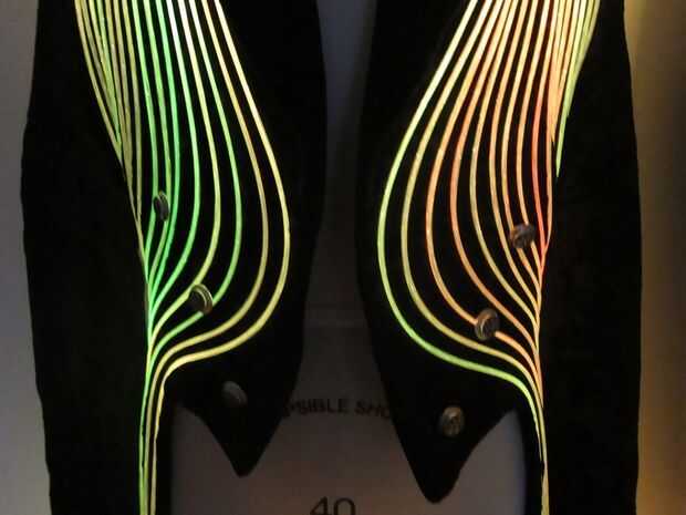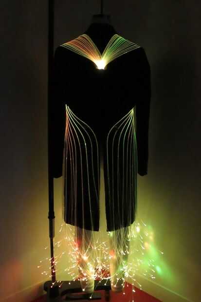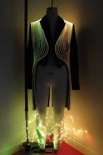 ¿Por qué un frac? Mucho del pensamiento entró en decidir lo que haría más sentido para la moda masculina. El diseño del vestido era ideal para mostrar las fibras tenían una extensión alrededor de la falda de 360 grados, y un montón de Levante para que puedan colgar libremente para mostrar los patrones de iluminación mejor. Yo podría haber utilizado la misma idea para una capa y tenía colgar libremente alrededor de adelante hacia atrás, pero sin la elevación y la forma que la falda proporciona creo que el efecto sería demasiado uniforme. Sin embargo con un frac las fibras podrían todavía colgar libremente en la parte posterior para el movimiento, teniendo líneas de diseño en la parte delantera para mostrar la forma de la chaqueta.
