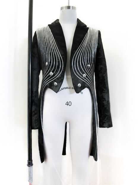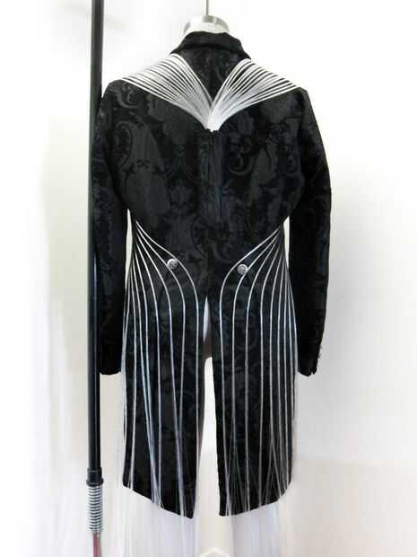 El siguiente fue selección de capa. Hay un montón de tailcoats, pero nos decidimos por éste, y resultó de gran. Es un estilo regency y está diseñado para ser usado abierto que funcionó muy bien para este diseño. Algunos tailcoats se superponen en la parte delantera y están destinados a usarse cerrado, y que no habría permitido casi tanta libertad de diseño para la colocación de las fibras.