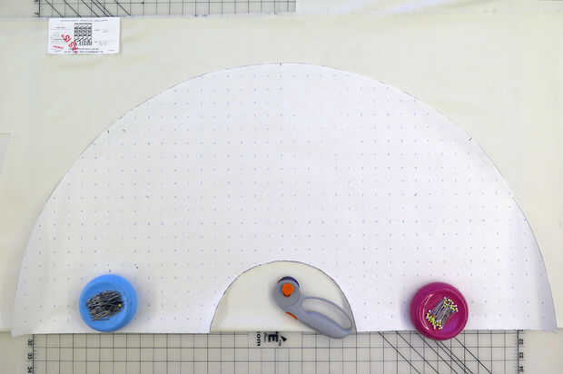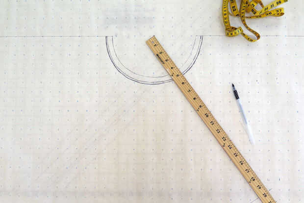 Ahora por la mitad más fácil del vestido, la falda de círculo. Primero hice un patrón de papel, usando matemáticas. Wow, imaginar usar pi en confección. Tomar la medida total en la parte inferior de su blusa (excluyendo el margen de costura para donde va la cremallera) y dividir por pi para obtener el diámetro interior. Dividir por dos para el radio, y desde un punto central uso una regla a punto ese radio a lo largo de un medio círculo por lo que será la costura de la cintura. Después del punto en el círculo externo de la longitud deseada de la falda.