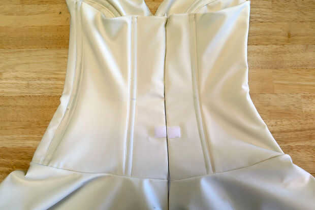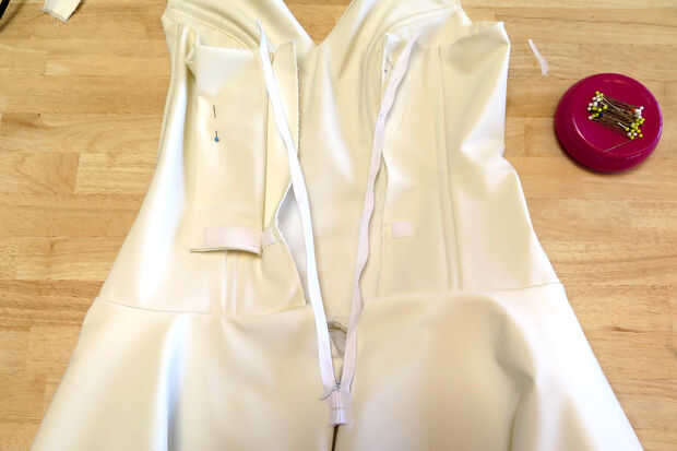Ahora que tengo mi buena nueva apertura listo y esperando una cremallera otra vez, el primer paso es establecer mi cremallera y ver cuánto se debe. Medir de arriba abajo y agregar una barra tachuela donde debe terminar la cremallera. Recorte el exceso. Aunque no es totalmente necesario, también es útil con cremalleras invisibles de hierro flat(er) en primer lugar, por lo que es más fácil de coser.