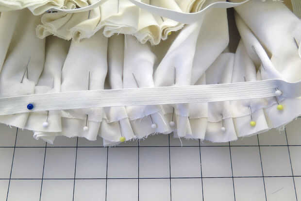 Había medido hacia fuera un pedazo de elástico con un ajuste apretado un poco mi cintura y se dio cuenta de que aunque estira a es máximo, no pude coincidir hasta la circunferencia de la falda de círculo. Por lo tanto, el círculo entero falda plisada con pasadores, con muescas en cada punto de la cuarta parte a coincidir con los puntos de barrio a lo largo del elástico. Una vez todo bien fue fijada en su lugar, había cosido abajo del elástico y tenía mi falda de burbuja.