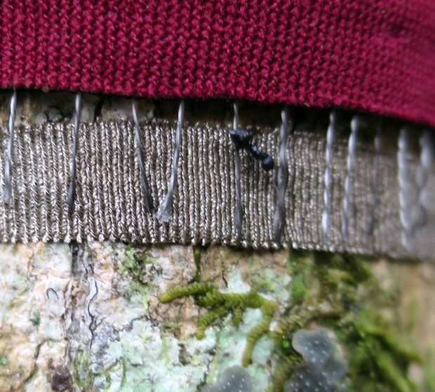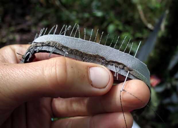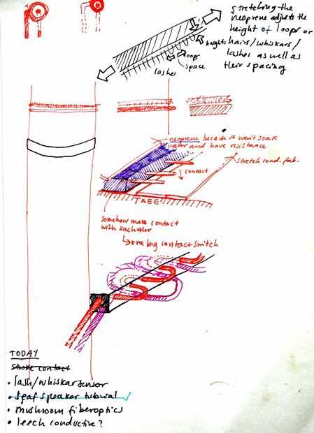 El prototipo inicial que hicimos no funcionó realmente muy bien porque el más fino hilo conductor que teníamos era demasiado grueso. Hannah está trabajando en una nueva versión de ellos con tela super delgada que tenía en casa que es realmente como una "pestaña" de espesor.