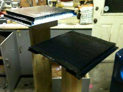 Primera capa de fibra de carbono en la puerta de la celda. Después de curado de la resina, exceso fue recortada, enarenada y segunda capa demasiado pulida de fibra de carbono aplicada.