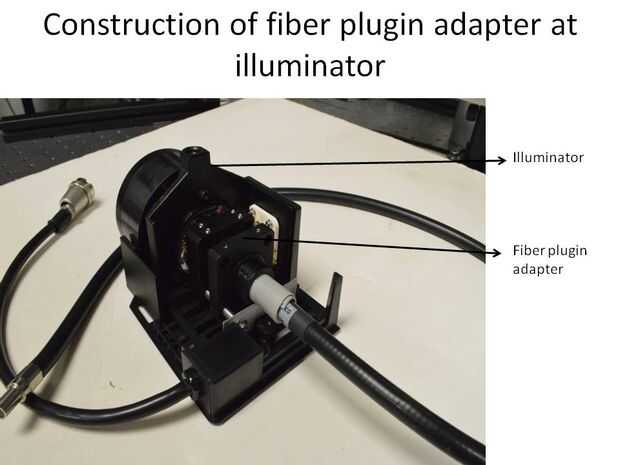Fibra-alimentador esté conectado a la fuente de alimentación con conectores de banana y utiliza la misma lámpara como el iluminador. Adaptador de fibra se encuentra en una placa de jaula traducción de xy para los últimos ajustes poco. La fibra puede ser insertada a través de la abertura.