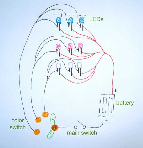 Al principio pensé sólo sería llevar el interruptor de clip de papel desde el blanco hasta el azul, a rosa. Entonces se me ocurrió eso si el clip de papel tocado que azul y rosa, podemos tener dos LED de colores encendidos. Así que rediseñé el interruptor para permitir a 7 combos de color: blanco, rosa, azules, blancos y rosa, blanco y azul, rosa y azul, blanco y rosa y azul. Ver fotos en el siguiente paso.