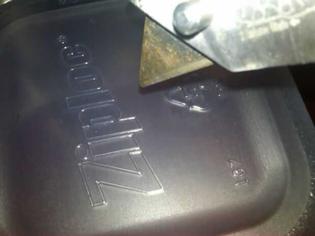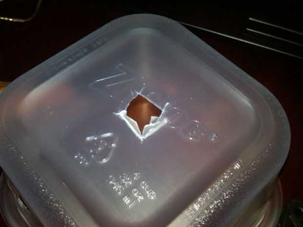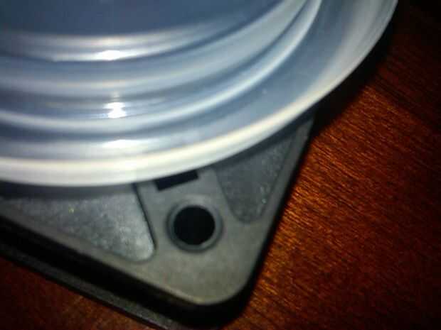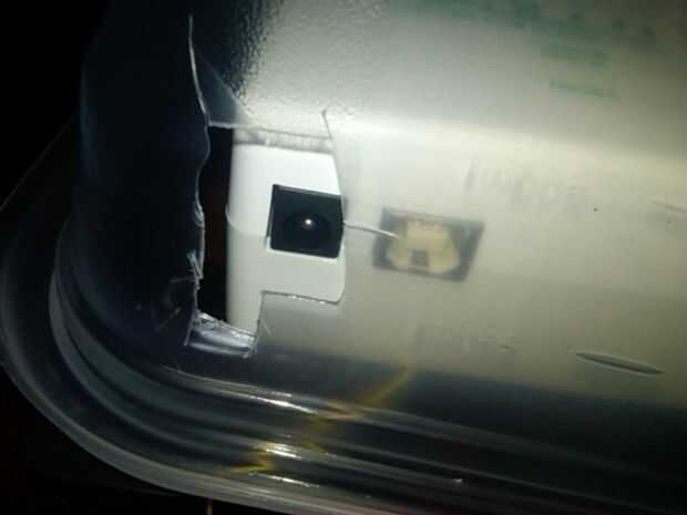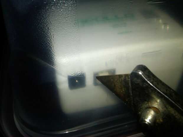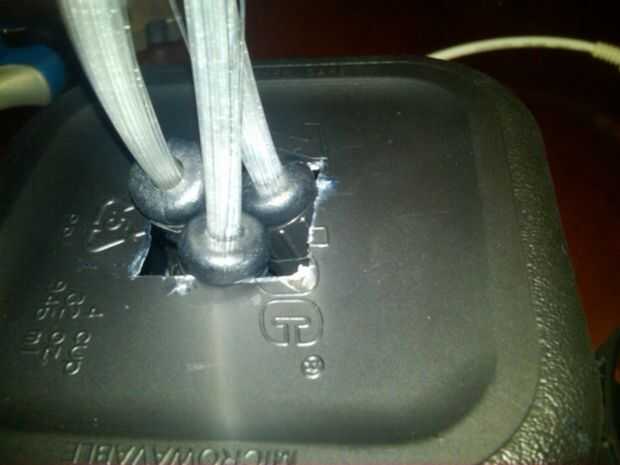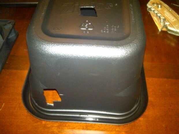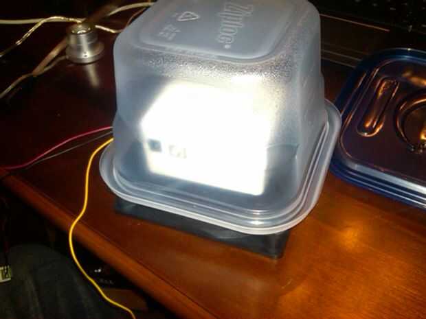 A continuación es para hacer cortes en la esquina de la tupperware etcétera que más adelante se puede zip atar la caja del ventilador de la computadora. No necesita hacer un agujero en el tupperware, apenas una rendija hará. Mida en la parte superior de la tupperware y hacer un agujero para que pueden salir sus filamentos ópticos de fibra. Usted puede hacer este agujero tan grande o tan poco como usted tiene gusto, opté por hacer que algunos de la carcasa de plástico sale a través de darme más de una base.