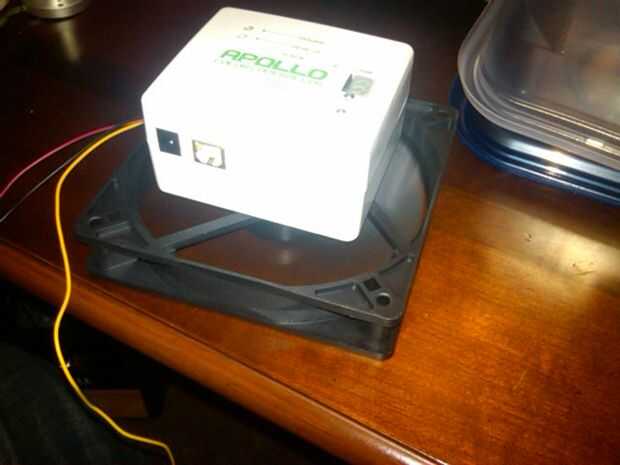 Tomar el dispositivo Color y pila en la parte superior del ventilador de la computadora. Lo mejor sería dar la vuelta boca abajo el ventilador de la computadora con las aspas del ventilador expuestas hacia el Apolo. De esta forma tienes una plataforma segura para montar el Apollo al ventilador. Luego tomar su envase de Tupperware en ambas unidades y marque la ubicación de la conexión de alimentación y conexión de cable de datos para que usted puede cortar un agujero de acceso.