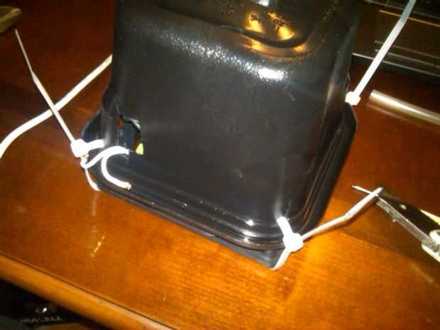 Tomar la caja de Tupperware y colóquelo sobre el ventilador y utilizar abrazaderas de plástico en las esquinas para asegurar el ventilador en el tupperware. Asegúrese de que todos sus filamentos de fibra óptica están hacia fuera, puede configurarlos más tarde. También asegúrese de que los cables de potencia salen y tienes acceso a la conexión del cable de datos para su Apollo.
