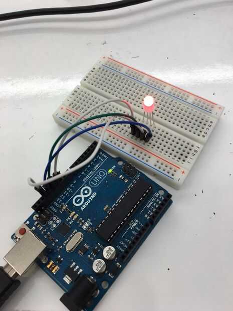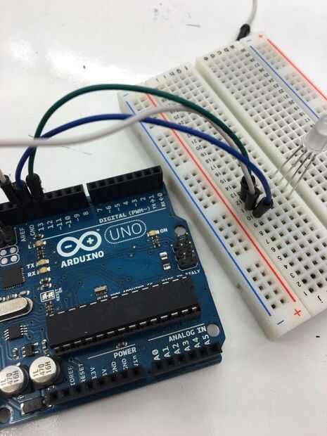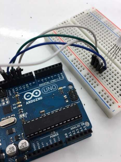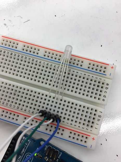 La imagen de arriba es el circuito básico que utilicé. Observe que este circuito utiliza una resistencia. Esto quité porque los LEDs eran demasiado débiles. Vea las imágenes de arriba para crear el circuito. Conectar los cables a los pines como se muestra: rojo en el pin 11, verde en el pin 12 y azul en el pin 13. Conecte el cable de tierra directamente al cátodo común de lo LED. Asegúrese de que dejar espacio para 4 LEDs para conectarse a la protoboard. A continuación, conecte los 4 LEDs como se muestra arriba. Antes de hacer cualquier cosa, asegúrese de que sus obras de circuito y, a continuación, proceder al siguiente paso.