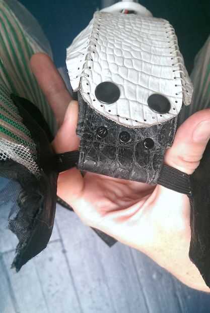 Una vez hecho esto he intentado el casco determinar cuánto tiempo para hacer el elástico que se mantienen unida en la parte posterior. Luego cubrió el elástico en el y trató probar otra vez. La tapa gris iba a fijar en la parte de atrás haciendo un bucle que cabría firmemente alrededor de la venda de elástico, por lo que después cosí el elástico en, marqué el lugar donde el cuero gris debe cumplir con el elástico, y luego clavado en el elástico.