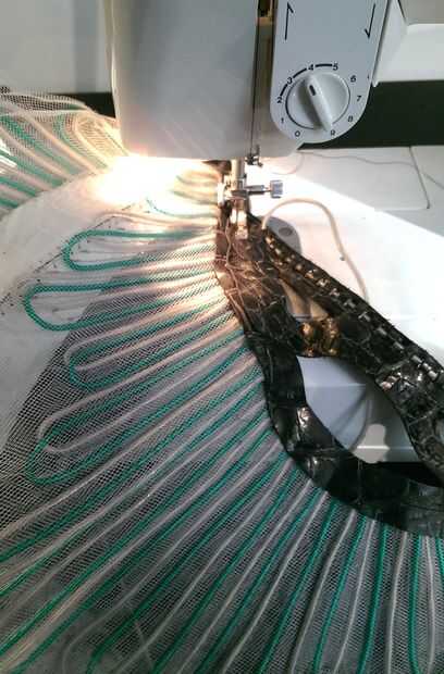 Ahora os adjunto estos dos componentes principales del casco por coser la aleta hacia abajo sobre la tapa donde se cruzan los dos en la parte delantera de la cabeza. Fue algo complicado porque implicó coser a través de algunas capas de la piel, por lo que recomiendo usar una máquina industrial.