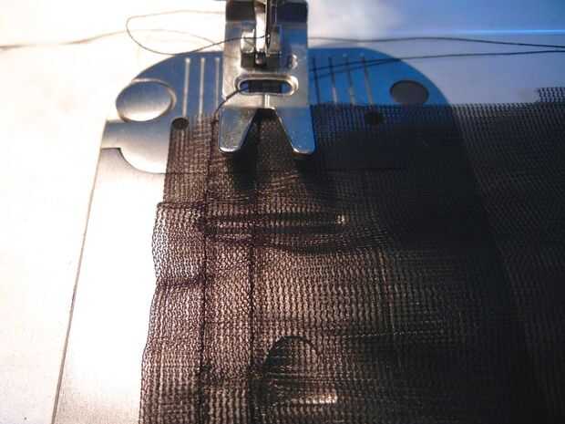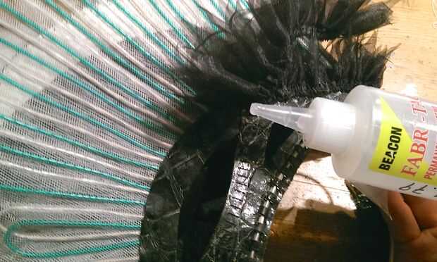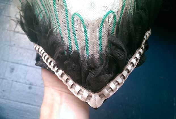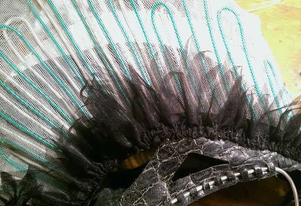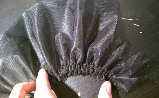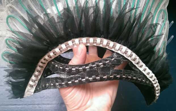 El primer paso para embellecer el exterior del casco era crear la tira con plumas de volantes negro que quería poner a lo largo de la base de la aleta. Para hacer esto simplemente tomó una tira larga de tricot negro rígido, por lo menos 4 veces es longitud final se reunieron y aproximadamente 5" de ancho. Esta había doblado encima por lo que fue sólo 2 el 1/2" ancho y coser una doble fila de largo plisado puntadas a lo largo del borde doblado. Luego reunió a la longitud correcta y el borde de plumas por cortar con tijeras.