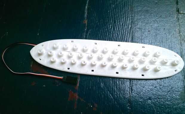 Ashley modeló esta pieza en Solid Works e impreso en filamento Ninjaflex TPE en un Makerbot. Ninjaflex es genial ya que no sólo es fuerte y flexible, también difunde luz bastante bien, que le dio la pieza impresa todo 3D un resplandor agradable cuando el casco fue completado.