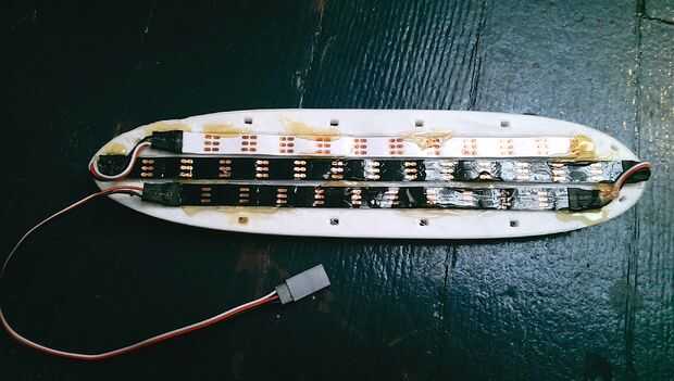 Antes de colocar la parte de la piel, viro mi hilos LED en las hendiduras que Ashley había modelado en la parte inferior con pegamento caliente. Los LEDs se llevará a cabo muy eficazmente cuando se intercala entre la parte impresa 3D y el cuero, pero un poco extra pegamento ayuda.