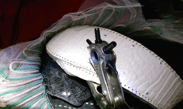 Decidí utilizar pequeños remaches para unir mi LED y 3D parte impreso en la parte superior de la caja de cuero blanco. Para ello pedí Ashley poner agujeros en los lados de la parte que ella modeló. No planeé por delante bastante láser corte correspondientes agujeros en mi piel, así que utilicé la parte 3D para marcar donde estos agujeros debían ir y luego perforados con un punzón de cuero. También corté un agujero más grande en el frente de la superior de la caja de cuero, lo suficientemente grande para encajar el conector en el extremo del alambre hacia los LEDs.