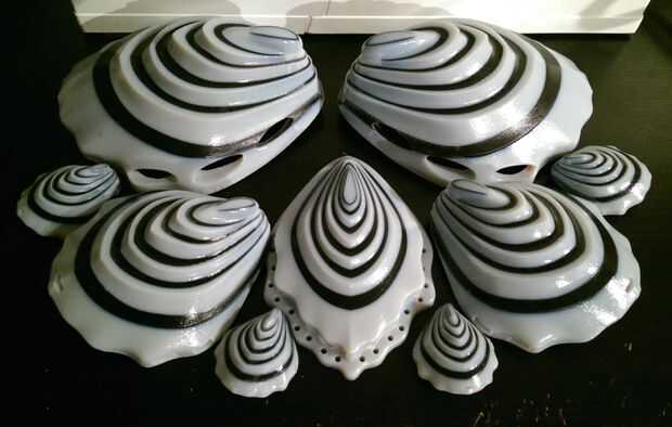 Opté por imprimir mis conchas en una impresora que fue cargada con Vero White y tango negro. Importan mis archivos en el software de impresión de Objet haciendo shift + clic en ambos archivos e importarlos como un conjunto. Esto trae en el software de impresión correctamente alineado. Una vez que los archivos fueron importados, me ha hecho clic en los dos tipos de rayas y les asigna diferentes materiales. Mi impresión final fui con una combinación digital de 80% negro y blanco para las espinas oscuras, 20% y 80% blanco y 20% negro para las espinas más ligeras. Lo hice porque no quería que las secciones negras para ser demasiado suave, y también quería las secciones luz para tener un ligero dar a ellos. En retrospectiva podría han ido con blanco completo para las secciones de la luz, porque el gris no difunden la luz así y lo hizo ver un poco sucio.