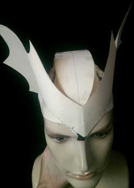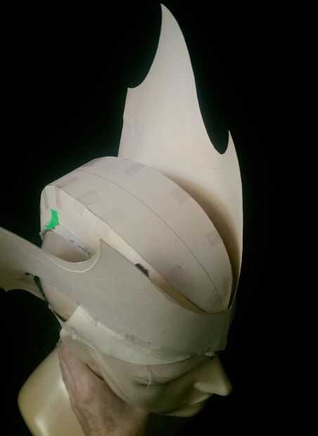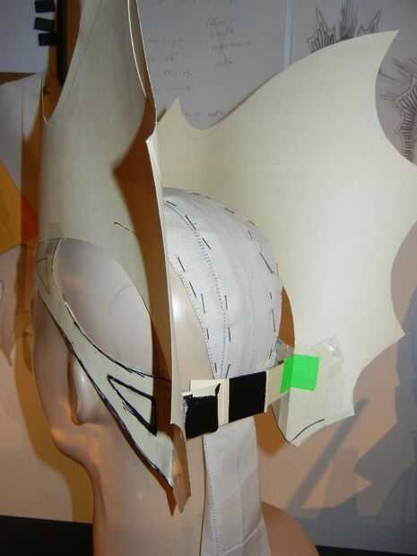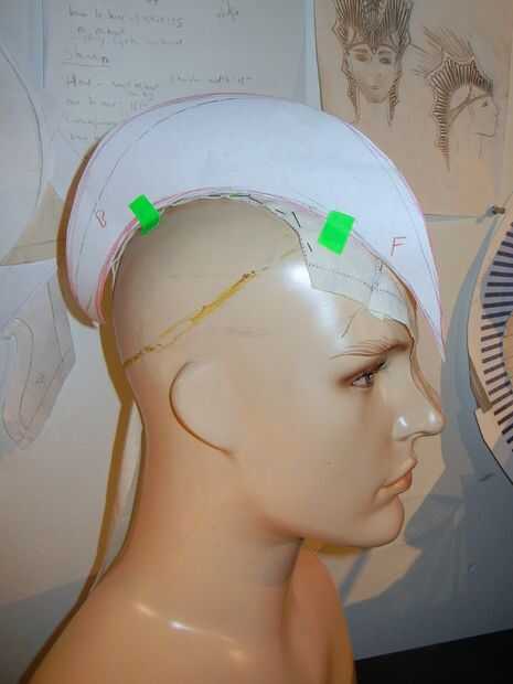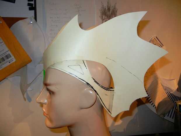 Decidí que el casco iba a consistir en dos secciones principales. La aleta de alambre el exterior y la cresta de óptica de fibra interna que descansaría sobre una especie de cuero de la tapa en la cabeza. Para obtener la forma correcta para todos los componentes de este casco, utilicé oaktag, muselina y una forma principal para "cubrir" una maqueta de la pieza. Primero se burló de las aletas y laterales 'correas' en oaktag, al mismo tiempo refiriéndose a mi bosquejo, probando la pieza y altera hasta la forma que quería.