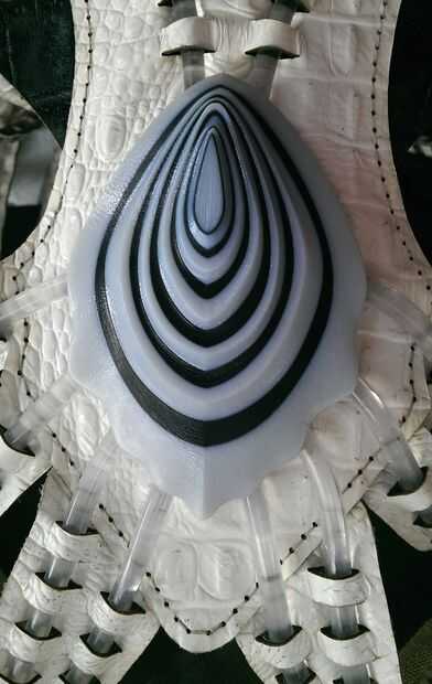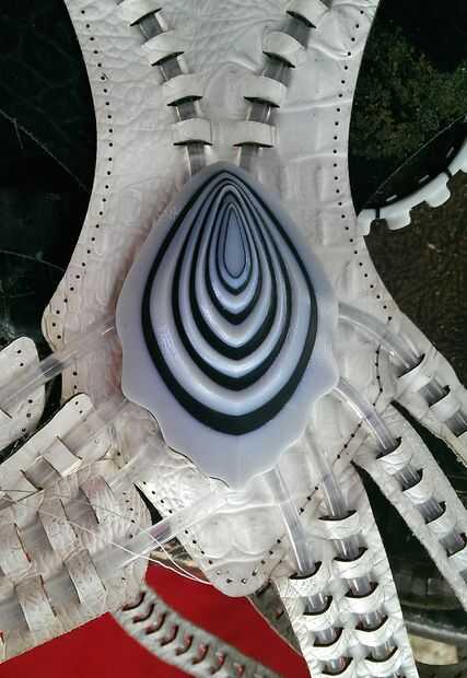 Antes de coser la sección alrededor de la cáscara del pecho, tuvimos que encajar la cáscara del pecho en el agujero que tenía del corte en el cuero blanco. A continuación, inserta la óptica de fibra en los agujeros de la cáscara y había atado al lazo impreso 3D con el LED adentro. Esta configuración todo funcionaba tan bien como esperaba y definitivamente podría utilizar algún refinamiento.