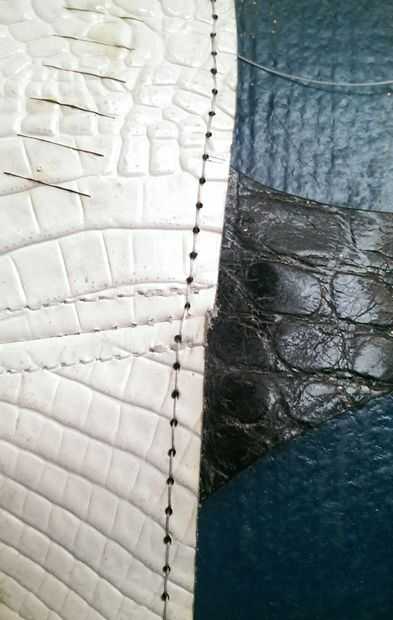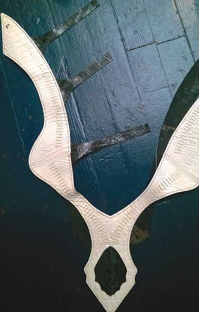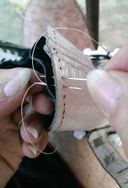 Usando los agujeros de costura tenía del corte en el cuero, suturan el frente y atrás del arnés con una silla de montar. En los lugares donde las cintas y filamentos de fibra óptica de cuero se reunió con el cuerpo principal del arnés, había intercalado entre las capas de cuero blanco y gris y les cosieron.