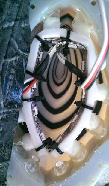 Las fibras que resultó para ser un poco demasiado grande para los agujeros en las piezas Ashley había impreso. Acabó pelando la vaina clara de los extremos de las fibras por lo que pude encajen en los orificios, y tuve que probar unos cuantos diferentes tipos de pegamento antes de que encontré uno que funcionaba bastante bien, que era pegamento. (Pegamento, que probé en primer lugar, no se adhiere a las fibras). También fui capaz de encontrar una manera de encajar las dos fibras de la parte inferior en los nodos de LED, que dejó sin su propia fuente dedicada de la iluminación. Claramente esta parte del diseño tiene que ser refinado.