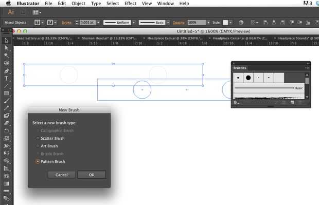 - Arrastre para seleccionar los círculos y el rectángulo y arrastre en la paleta de pincel. En el cuadro de diálogo que aparece, elegir 'cepillo de patrón', en el pantano de cuadro de diálogo siguiente, nombre y guarde su cepillo.
