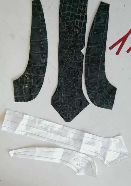 Una vez que se hicieron todas las piezas de mi patrón, recorto. Primero me tomé mis piezas del patrón trazado en mi cuero gris con tiza y recorte con tijeras. Corté el pedazo de uno centro y dos piezas laterales. (Mis piezas busca un poco funky en esta foto porque estaba quedando sin cuero).