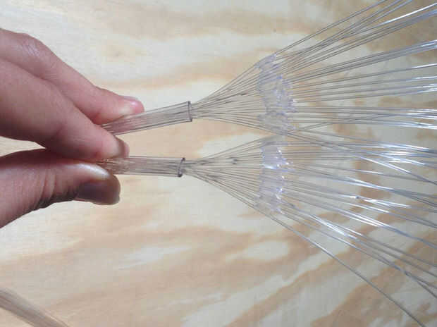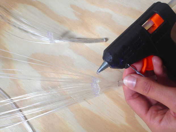 Ahora los filamentos individuales estén casi hechos. Para una falda fuller busca, tenemos que separar las fibras. En el extremo del tubo donde salen las fibras, repartirlos uniformemente aparte y con cuidado poner pegamento caliente en la parte superior. No utilice demasiado pegamento o ponga la pistola de pegamento demasiado cerca aunque porque las fibras se derretirá y la curva. Mántengalo en esa posición hasta que el pegamento se seque.