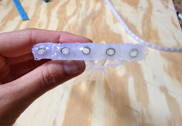 La tira del LED tiene una funda de silicona desmontables, impermeable. He intentado muchas colas diferentes pero nada pegado permanentemente a la silicona. Sin embargo, quería mantener la caja del silicón para protección.