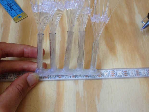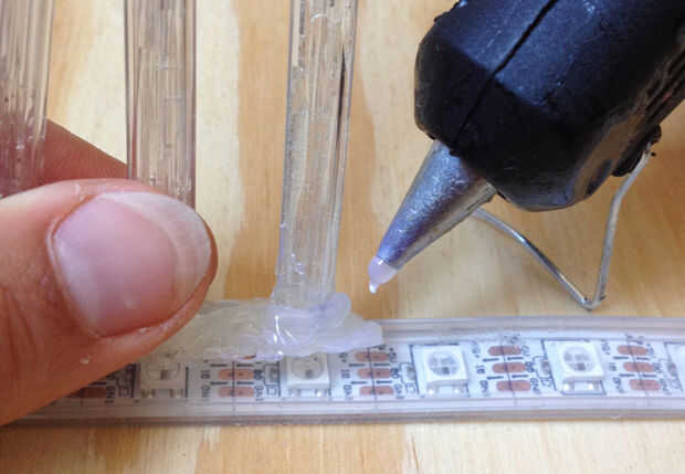 Para instalar el paquete de la fibra sobre cada LED, es necesario construir un soporte pequeño de pegamento caliente. Pon un filamento óptico de fibra en la parte superior un LED y pegamento caliente alrededor y en el lado derecho e izquierdo del tubo – espere a que esté seco. Repita para todas las otras hebras de fibra, individualmente. Entonces cuidadosamente derretir el pegamento en el lado y unir tubos de 4 a 5 – preste atención a la distancia entre los tubos de vinilo. Al final, cada paquete de la fibra óptica debe ser justo en la parte superior de un LED.