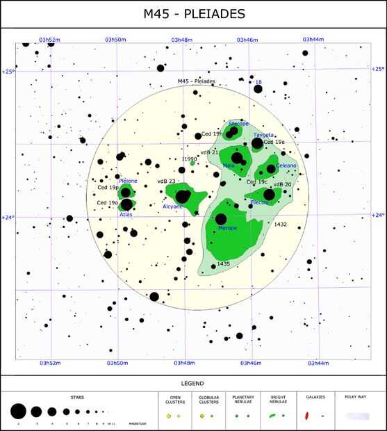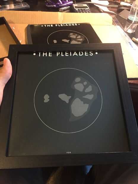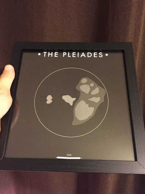 Lo primero que necesita hacer es elegir un diseño para su mapa de la estrella. Pude encontrar un mapa técnico finamente detallado (archivo adjunto) de las Pléyades y utilizó esto como base para mi diseño del fondo. Algunos de los elementos en el mapa fueron modificados por el bien de estética: el círculo se centraba, cambió el título, las líneas de división retirado, nebulosa marcas y alisadas. Lo importante, las estrellas no fueron incluidas en el fondo. Asegúrese de tener en cuenta el área del fondo que será cubierto por el marco. Una versión adicional del mapa con las estrellas estaba dispuesta a utilizar como recubrimiento para hacer las estrellas. He utilizado GIMP para el diseño de fondo; se incluyen archivos .xcf y la imagen de ambos.