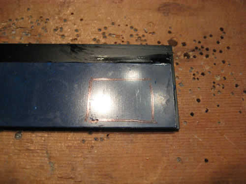 Cuando estás arriba que tendrás que corta un agujero en un par para el interruptor. Marcar hacia fuera - cerca de la parte inferior, no demasiado cerca el final de la obra. Perfore las esquinas del interruptor luego cortar entre ellas (yo usé una dremel con brocas y discos de corte).