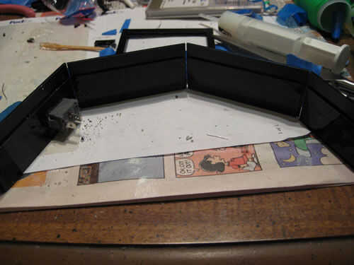 La Plaza del 'anillo' y dos 'en forma de U' piezas forman la parte inferior. Pegue la estrecha 'U' en la Plaza. Entonces pegar la 'U' más ampliada de eso. Esto forma una pista para la puerta de la batería en. La otra pieza cuadrada es una puerta, y la estrecha franja es el mango. Encolar el mango a la puerta.