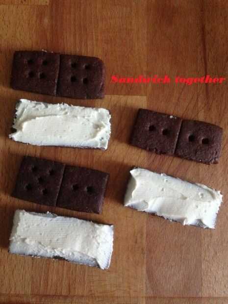 Extendió una gruesa capa de glaseado de mantequilla en un lado de la llanuras galletas sándwich con la otra. Presión para la formación de hielo por venir a través de los agujeros. Raspe el glaseado sobrante a los lados.