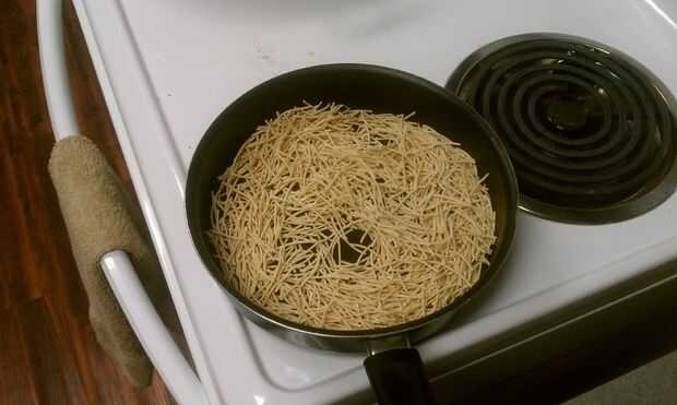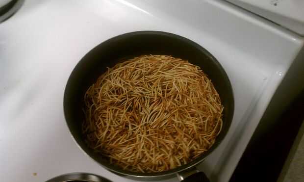 Este es un paso muy importante, no sé por qué pero agrega a la todo sabor de la sopa. Sólo volcar los fideos en una sartén sin aceite y dejarlos marrón fuego med mientras corté todo para arriba. No tarda mucho y solo quiere un tono más oscuro de marrón y lo que se ven como fuera de la caja. Tenga cuidado de no quemarlos.