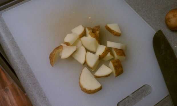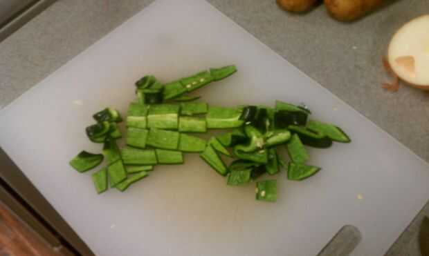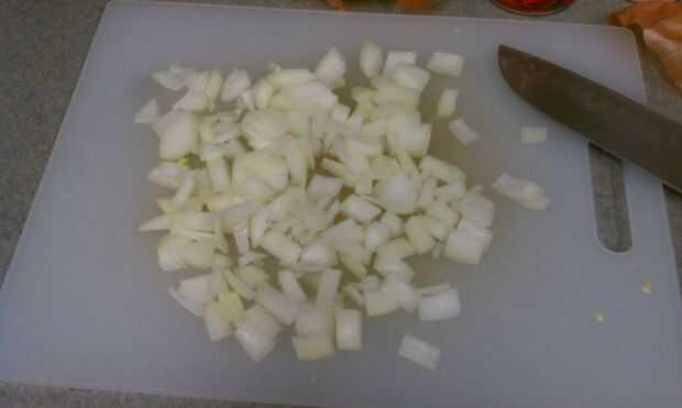 Cortar todo en dados de tamaño o más pequeños pedazos mientras estoy esperando en la hamburguesa y los fideos a brown.