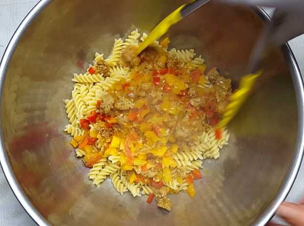 Retire del fuego y mezcle con la pasta cocida usando las pinzas.