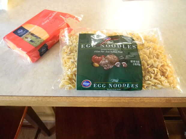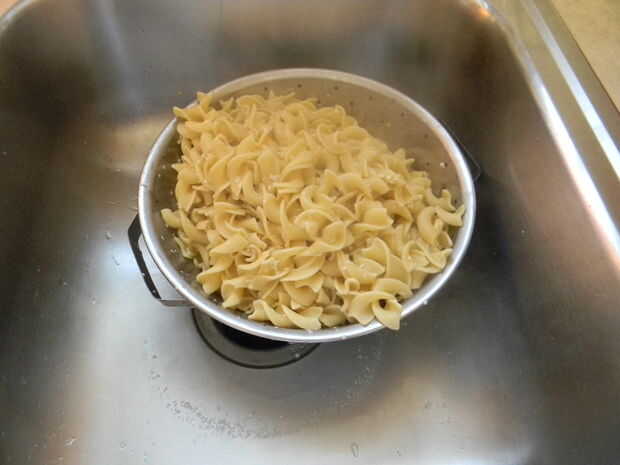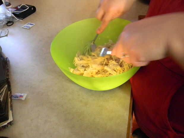 Ahora que te has ido por el día y el pollo esté cocido, retirar a un bol y desmenuzar con un tenedor. Vierta el caldo de pollo en la olla, luego agregue los fideos. Hervir los tallarines como normal y luego escurrir en el fregadero. Extensión de fideos a la cazuela, luego extiende el pollo sobre ellos.