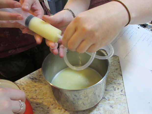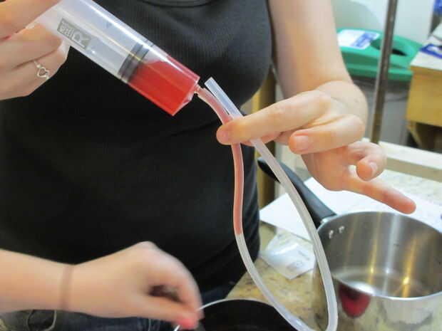 Tomar el líquido de la estufa y ponerlo en cierta superficie conveniente de calor.  Dibuje algunos en la jeringa, hasta que quede aproximadamente a la mitad lleno.  Tire del extremo de una de sus piezas de tubería de PVC sobre la punta de la jeringa y con cuidado dosificar en el tubo hasta casi el otro extremo (puede dejar unos milímetros vacío al final para evitar el desbordamiento).  Tendrás que repetir esto varias veces mientras los fideos se solidifique, el líquido puede enfriar demasiado y comienzan a gelificarse en el bote.  En este caso, simplemente recalentar para volver a su estado líquido y volver a syringeing.