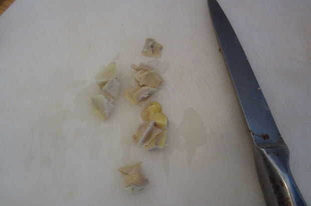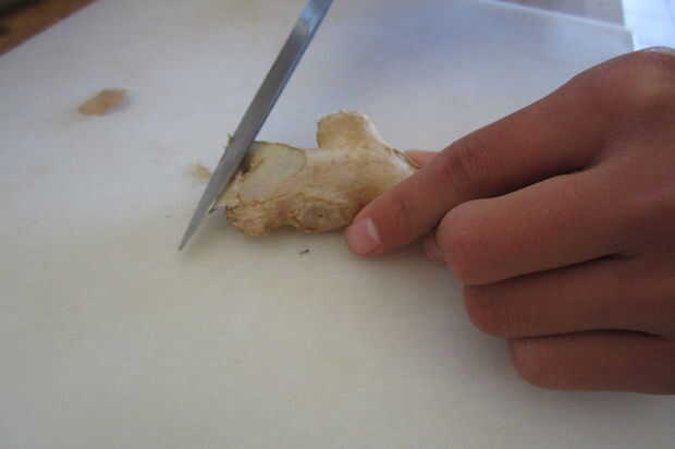 En primer lugar, pelar la raíz de jengibre para bajar la piel. Luego picar en trozos pequeños.