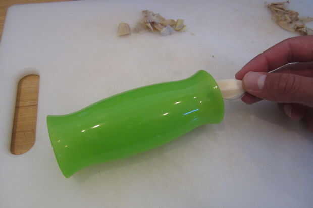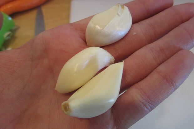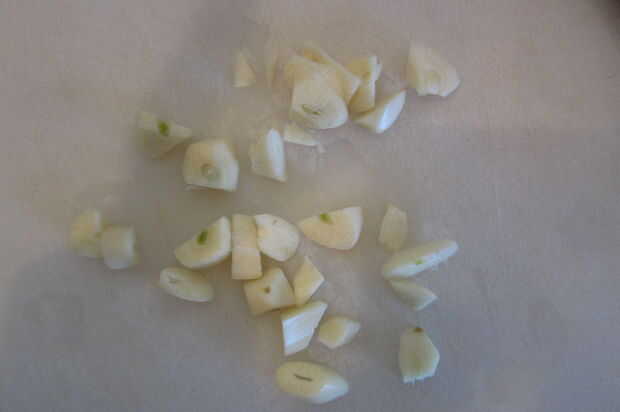 Luego pelar dientes de ajo (en cuadro, nota he utilizado silicona manga cosita para pelar los dientes de ajo, funciona realmente bien) y picar en trozos medianos, también.