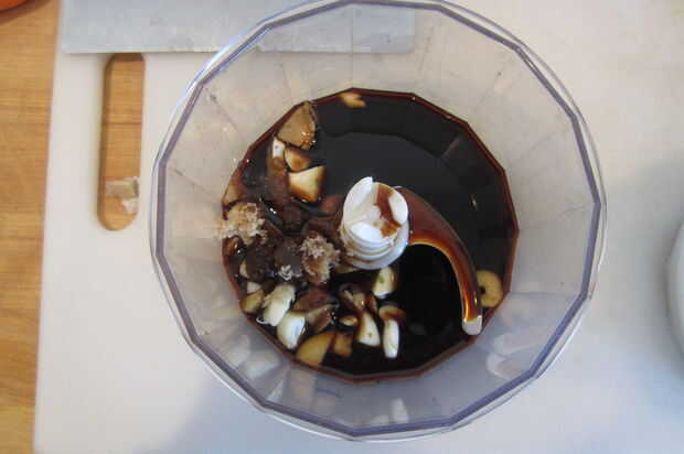 Coloca jengibre, ajo, salsa de soja y azúcar en licuadora ingrediente mojado. (puede utilizar una licuadora, o cualquier otra cosa que funciona, también). Mezclar durante 20 segundos o hasta que todo es picada.