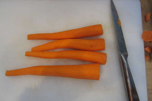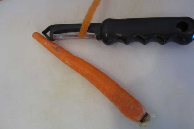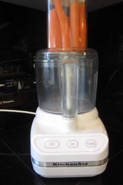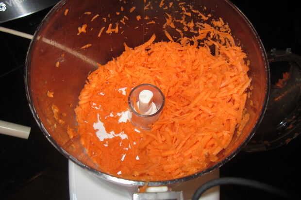 Pelar las zanahorias con un pelador de verduras y cortar los extremos. Triturar con un acoplamiento de trituradora de procesador de alimentos.