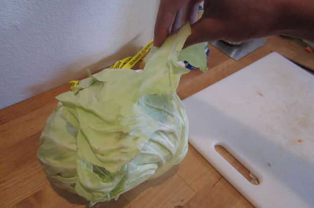 A continuación, pelar las hojas exteriores de repollo por razones sanitarias y cortar a la mitad (la mitad que va a utilizar) en trozos pequeños, suficientemente pequeñas para caber en el conducto del procesador. Si usted prefiere picar el repollo, luego hacerlo.