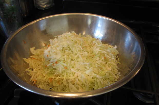 Nota: Para hacer las cosas mucho más fácil, podías comprar posiblemente ya rallada de repollo y zanahorias, ya ralladas, pero apenas lo hice manualmente: