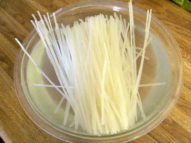Fideos de arroz se hacen de harina de arroz, que es tierra esencialmente de arroz. Simplemente remojar los tallarines en agua caliente suaviza y son comestibles. Me encanta trabajar con estos fideos.
